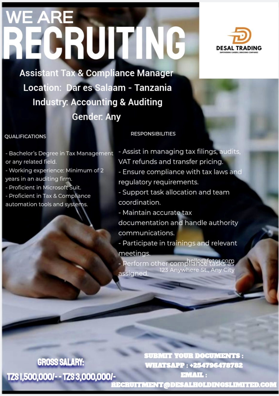 Job Location: Dar es Salaam, TanzaniaIndustry: Accounting & AuditingGender: Any Key responsibilities: What you need: What you get: Working Days/Hours:⏱Monday to Friday: 08:00 AM – 05:00 PM Gross Salary: TZS 1,000,000/- – TZS 2,200,000/- Submit your documentsWhat’s app: +254796478782Email: recruitment@desalholdingslimited.com