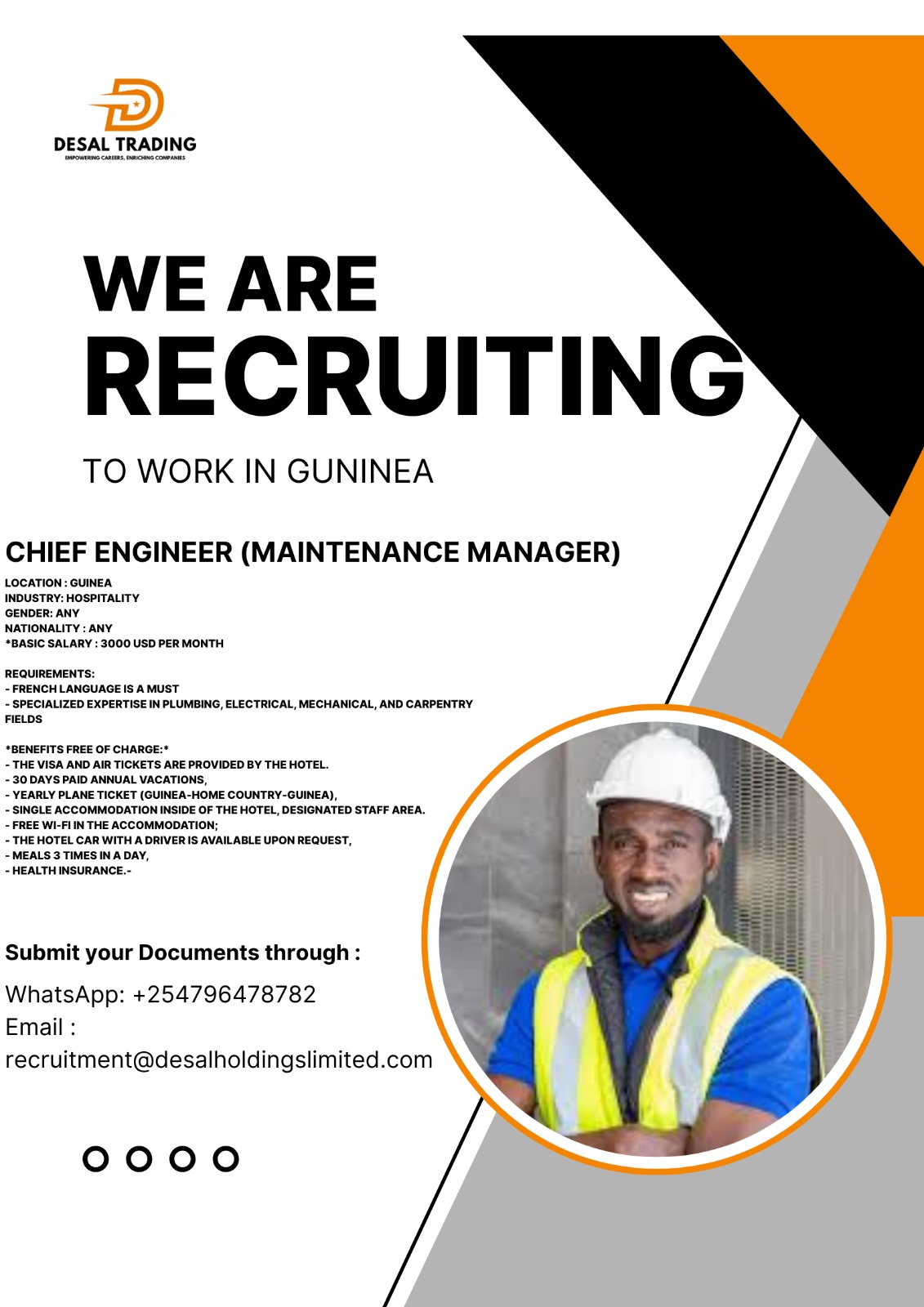 Location: Dar es Salaam – TanzaniaIndustry: Elevator SupplierGender: Any Key Responsibilities: What you need: What you get: Working Days/Hours:⏱Monday to Friday: 08:00 AM – 05:00 PMSaturdays: 08:00 AM – 02:00 PM Gross Salary: TZS 1,000,000/- – TZS 1,500,000/-Send your documentsWhatsApp: +254796478782Email: recruitment@desalholdingslimited.com