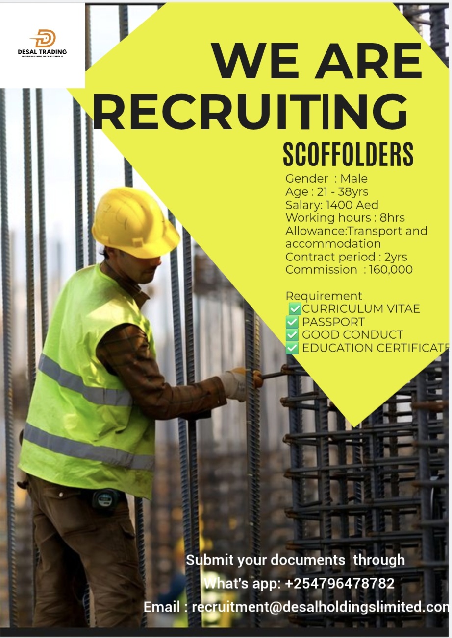 New company requirement DubaiGender : MaleAge : 21 – 38yrsSalary: ksh 47250Allowance: Food ,Transport and accommodationContract period : 2yrsSubmit your documents throughWhat’s app: +254796478782Email : recruitment@desalholdingslimited.com