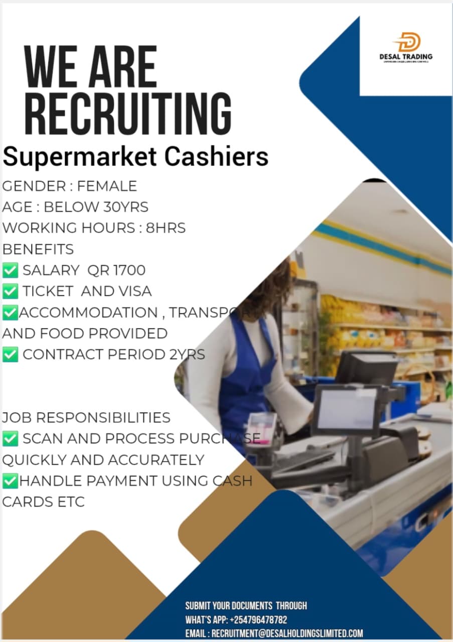 QUANTITY: 5GENDER : FemaleAGE : 21- 35 YRSWorking hours : 8hrsBENEFITS✅ Salary :1500 SAR✅ Ticket and visa✅Accommodation and Food provided✅ Contract period 2yrs Submit your documents throughWhat’s app: +254796478782 Email : recruitment@desalholdingslimited.com